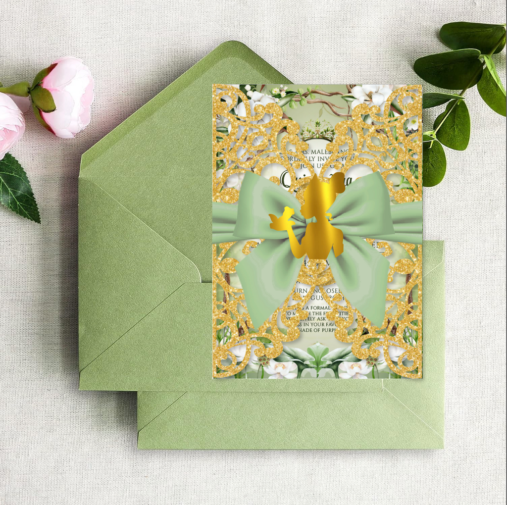 Princess Tiana and the Frog Gold Glitter & Sage Green Laser Cut Invitations