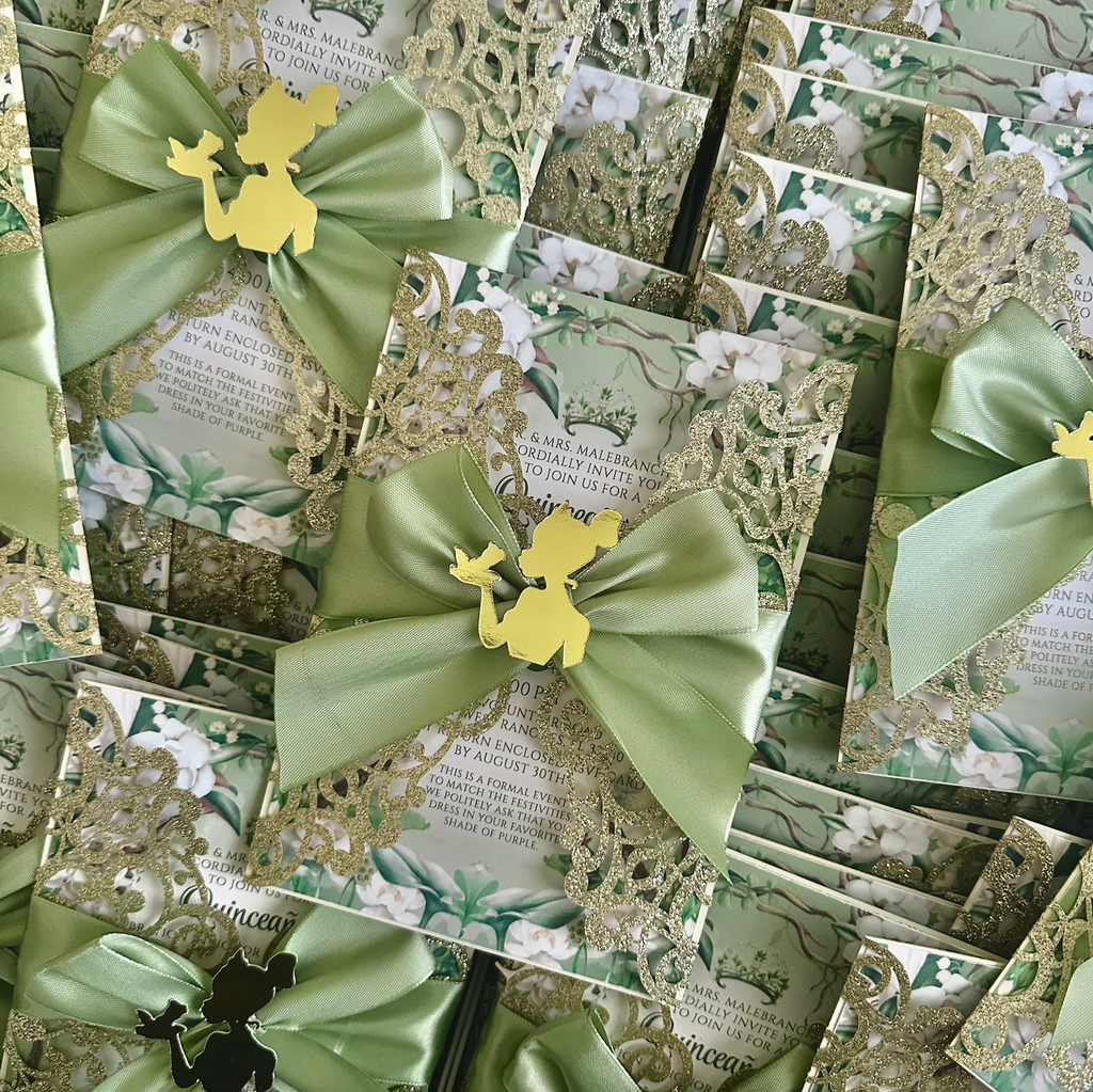 Celebrate like royalty with our Princess Tiana and the Frog-themed gold glitter laser cut invitations—a perfect choice for your Quinceañera, Sweet Sixteen, or any magical celebration. The elegant combination of gold glitter and sage green brings the enchantment of Tiana’s fairytale to life with a regal, modern twist.
